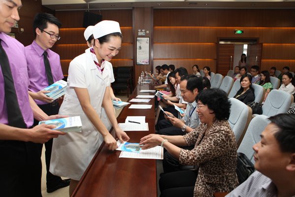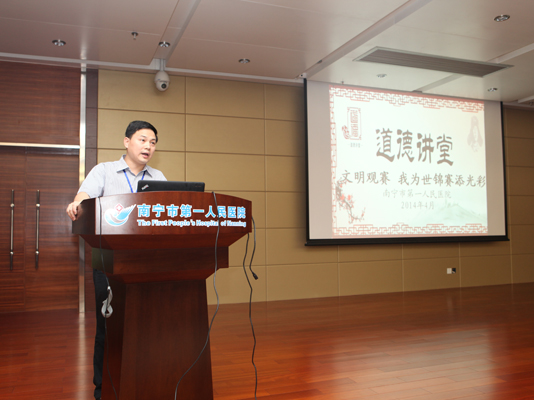4月25日下午,南宁市卫生系统2014年第一期道德讲堂观摩会在我院礼堂隆重举行。南宁市卫生局所属各医疗卫生单位的分管领导、党办主任、道德讲堂主持人、七星社区领导以及我院医务人员共300人亲临现场参加了本次活动,南宁市卫生局党委副书记谭英姿出席会议,会议由医院党委书记黎君君同志致辞,团委书记周双双主持讲堂活动。