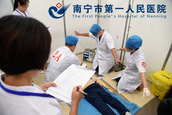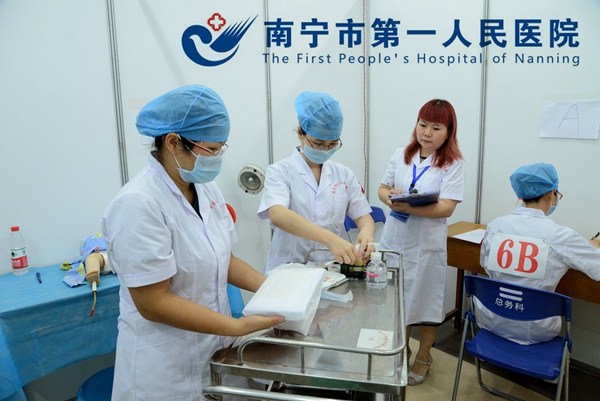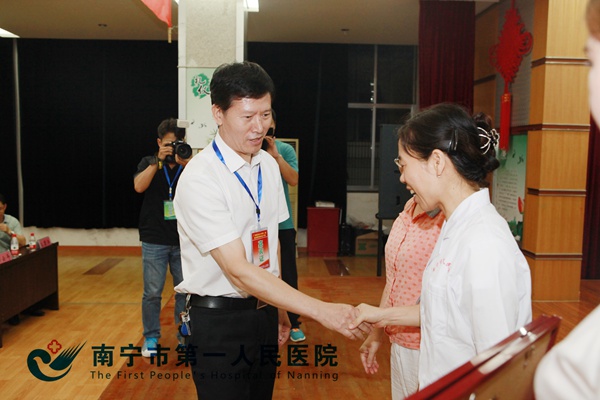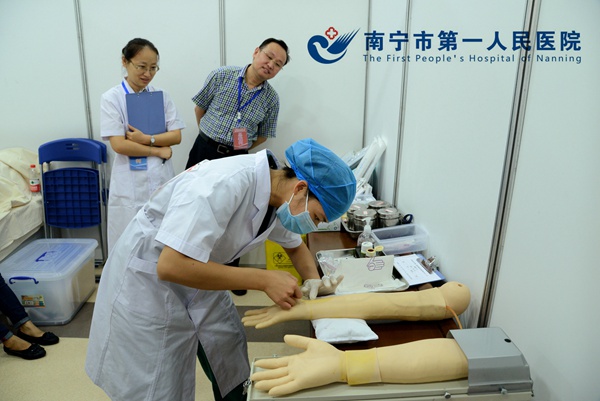 为不断提高临床操作技能、临床教学能力,切实提高临床师资技能操作水平,不断改进实践教学质量,培养出更多高技能、高素质的临床医师,为学校的全程教学开展作出贡献。在学校教育评价与教师发展中心的指导及院领导的正确领导下,经过4个月的精心组织筹备,由广西医科大学主办、我院承办的“2015年广西医科大学第二届临床医师操作技能大赛”于7月11日在我院成功举办。来自广西医科大学11家直属,非直属医院的11支参赛队参加比赛。 广西医科大学赵劲民校长、张志勇副校长、我院领导班子及各参赛医院领导参加了开幕式。在开幕式上,韦金儒院长代表医院致辞,他在致辞中对学校领导、专家及各附属医院的领导、参赛队员的到来表示欢迎,对为这次比赛付出辛勤劳动的广西医科大学、南方医科大学等各兄弟院校的各位领导、专家和我院的各位职工表示感谢,并希望各队参赛队选手在大赛上赛出水平、赛出风格,取得佳绩。